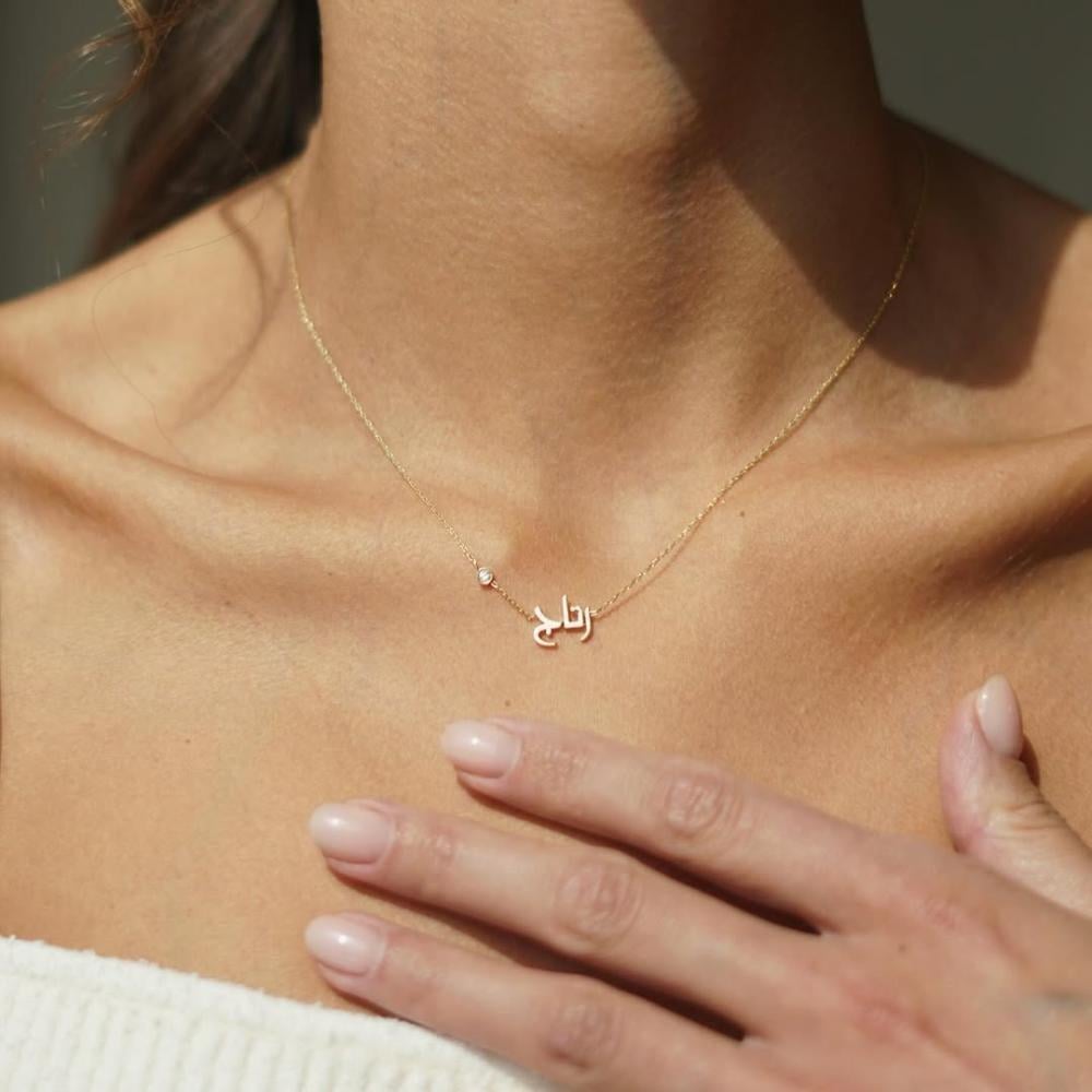 معلومات المنتج:مطلي بالذهب عيار 21 قيراط.يمكنك تخصيص أي اسم أو كلمة (عربي أو إنجليزي).متوفر ذهبي أو فضي.سمك 0.7 مم.تأتي في علبه و كيس عليه شعار المتجر من راقية.